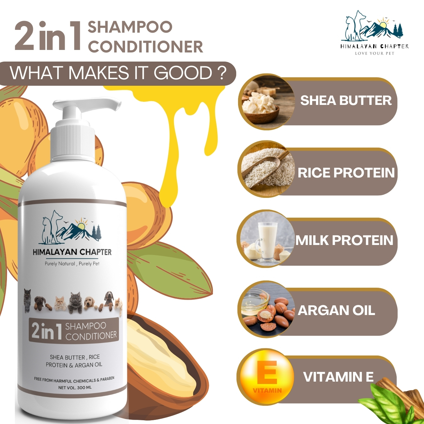 Simplify your pet's grooming routine with our 2-in-1 Pet Shampoo & Conditioner, expertly crafted to cleanse and condition in one easy step. Infused with luxurious shea butter, revitalizing rice protein, and nourishing argan oil, this all-in-one formula provides deep hydration and enhances your pet?s coat. Designed to leave your furry friend's fur soft, shiny, and manageable, it?s perfect for maintaining a healthy and beautiful coat while saving time during bath time.