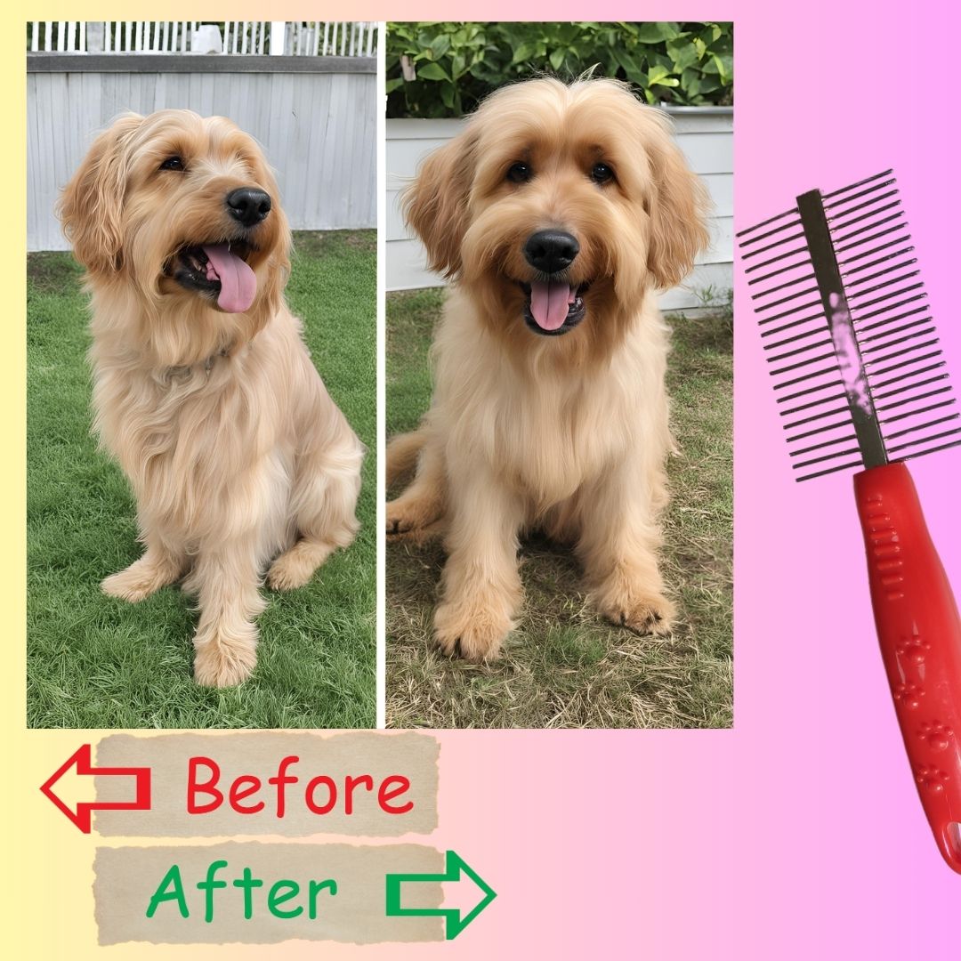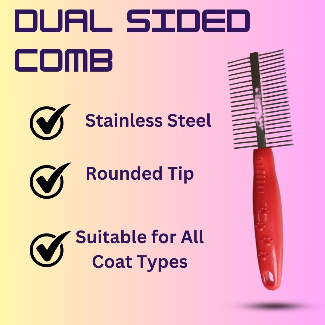 A durable, dual-sided grooming comb with a red handle, designed for pets to remove tangles and loose fur effortlessly.