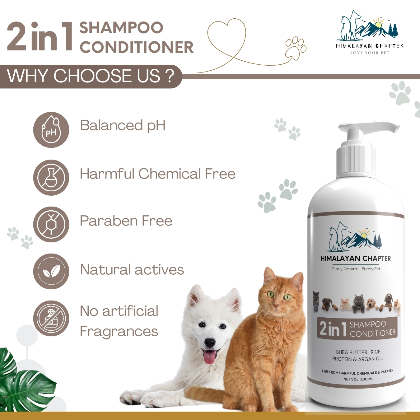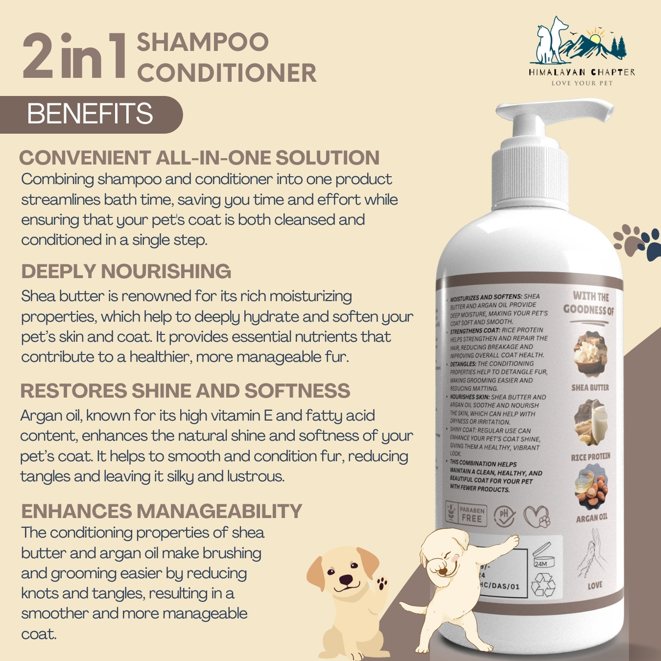 Simplify your pet's grooming routine with our 2-in-1 Pet Shampoo & Conditioner, expertly crafted to cleanse and condition in one easy step. Infused with luxurious shea butter, revitalizing rice protein, and nourishing argan oil, this all-in-one formula provides deep hydration and enhances your pet?s coat. Designed to leave your furry friend's fur soft, shiny, and manageable, it?s perfect for maintaining a healthy and beautiful coat while saving time during bath time.