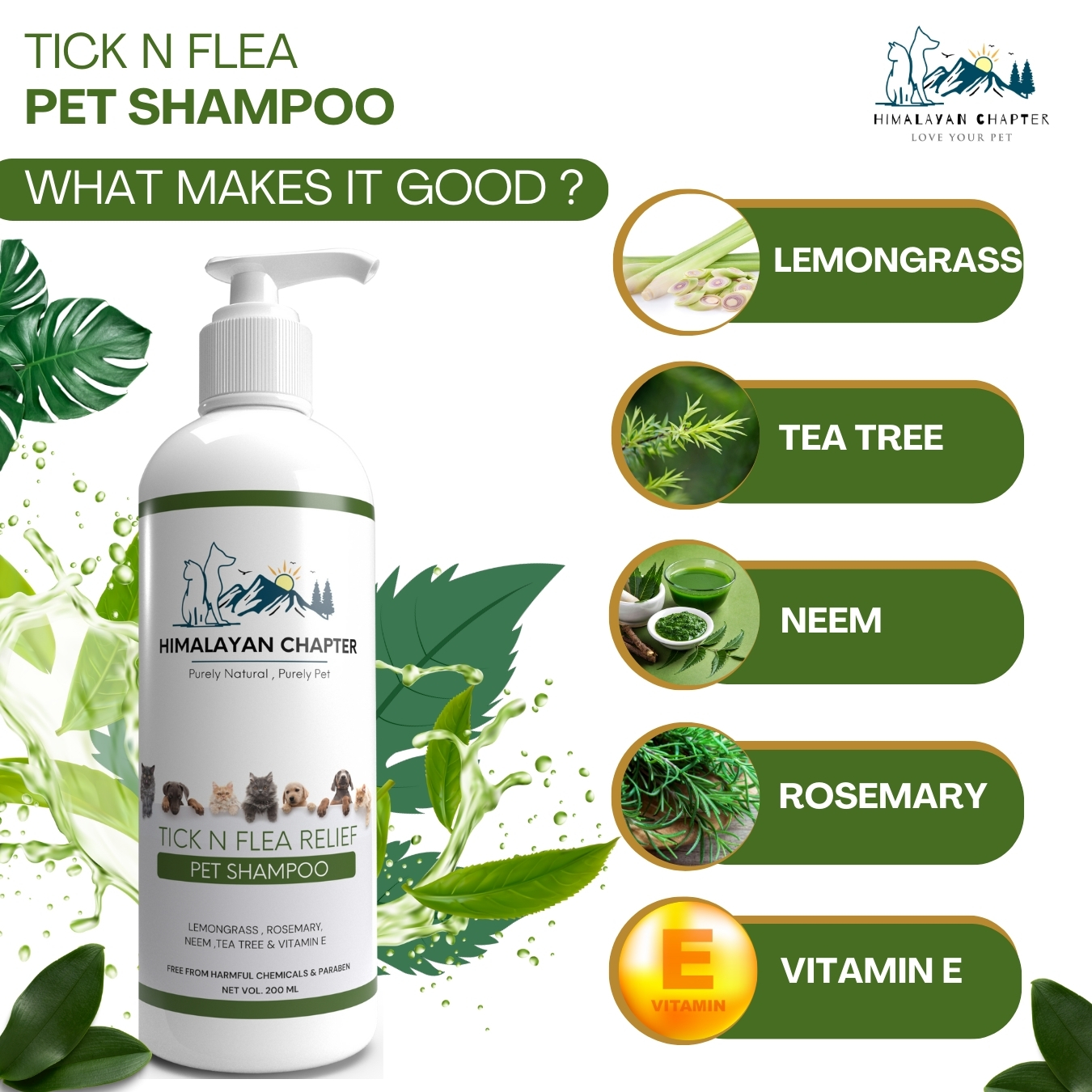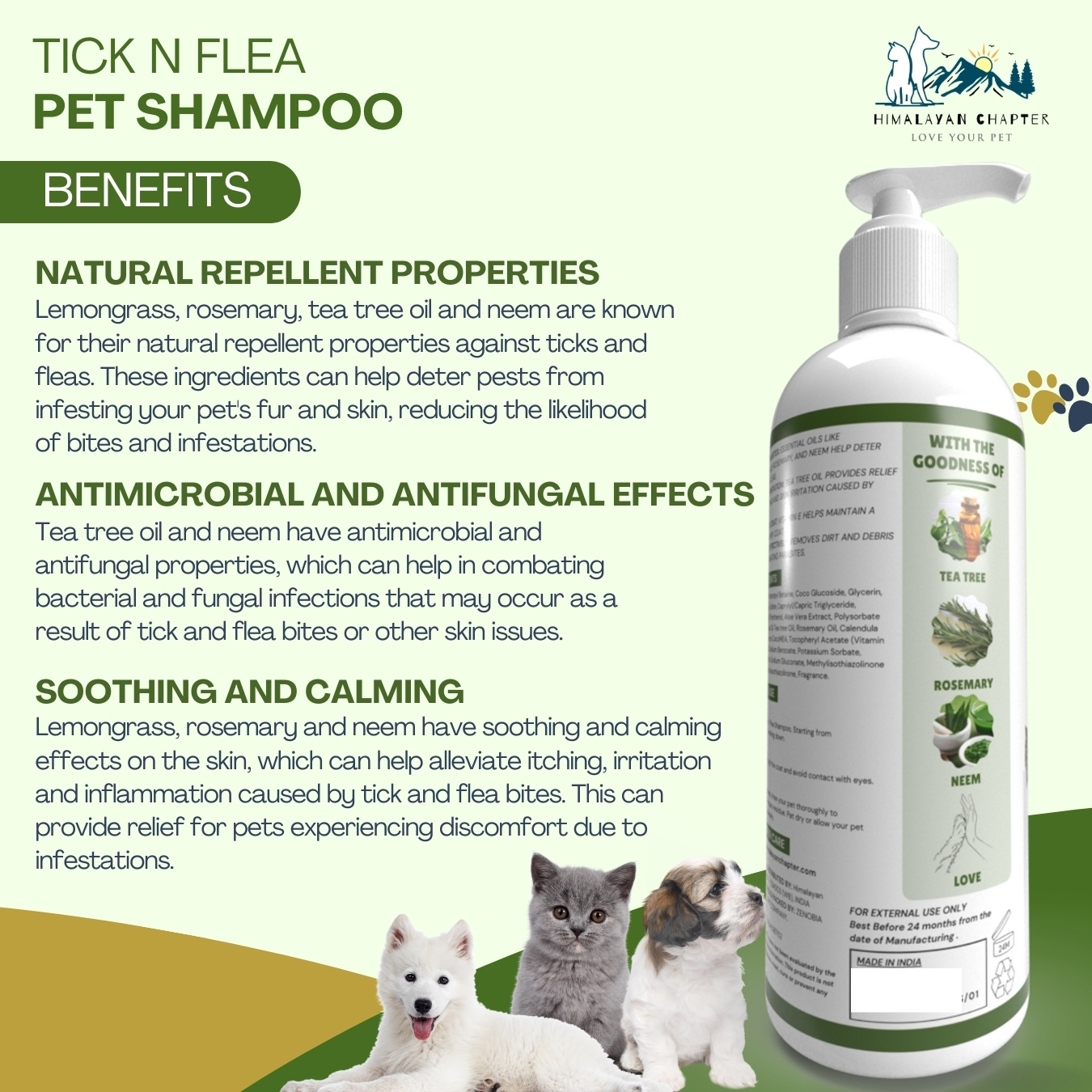 Guard your furry friend against ticks and fleas with our Pet Tick and Flea Shampoo, expertly formulated with natural ingredients known for their pest-repelling properties. Infused with the refreshing essence of lemongrass, the soothing touch of rosemary, and the protective benefits of neem, tea tree, and vitamin E, this shampoo offers a holistic approach to pest control while nourishing your pet?s coat and skin. Ideal for routine grooming and effective pest prevention, this shampoo ensures your pet stays clean, comfortable, and pest-free.
